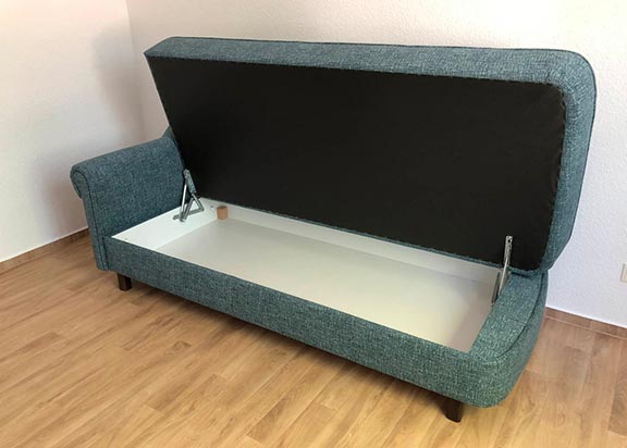 Vollwertiges Sofa und bequeme Liege mit ausreichend Stauraum. In zwei verschiedenen Größen lieferbar, Armlehne oder Kuschelecke möglich. Federkern im Sitz und individuelle Sondermaße auf Anfrage möglich.